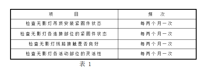 無(wú)影燈需有專業(yè)維修人員定期檢修,時(shí)間參考表1,并做記錄;如發(fā)現(xiàn)問(wèn)題,請(qǐng)按產(chǎn)品說(shuō)明書(shū)及時(shí)解決,若不能排除,請(qǐng)及時(shí)與生產(chǎn)廠家聯(lián)系。