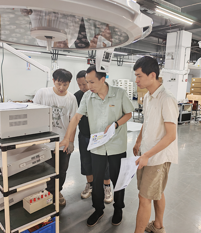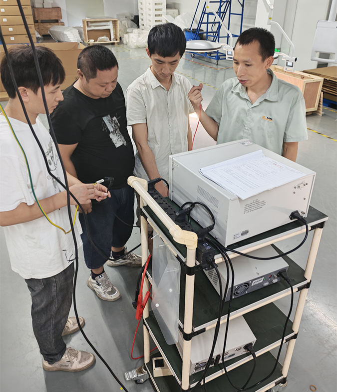 在湖南兆豐光電科技有限公司的無影燈生產(chǎn)車間內(nèi),一場別開生面的技能培訓(xùn)正在有序進行。經(jīng)驗豐富的技術(shù)工程師蔣工,為一線員工們系統(tǒng)性地講解和演示各類安規(guī)檢測儀器的正確操作方法。